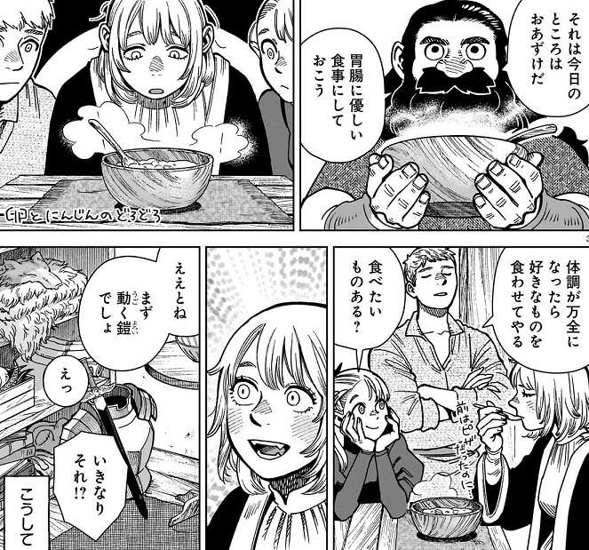 黄金城のワインなど色々な食材を貰いましたが、センシからは胃腸に優しい食事にしようと言われて、ファリンは卵とにんじんのどろどろのスープを食べることになります。ファリンはもっと違う食べ物が食べたかったようで不満顔ですが、ライオスから体調が万全になったら好きなものを食わせてやる、と言われて笑顔になります。マルシルから、食べたいものある?と、言われて、早速動く鎧をリクエストする辺りはさすがライオスの妹です。