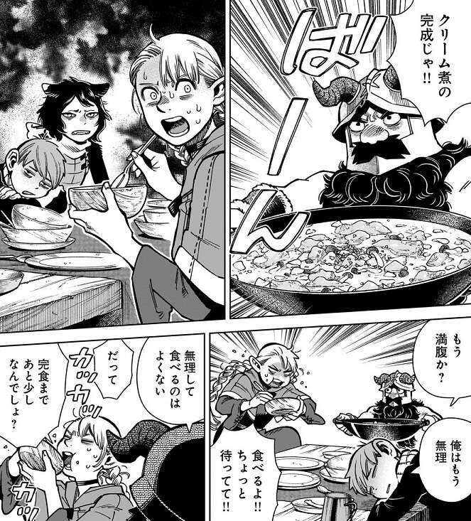 ファリゴンのクリーム煮が完成し、センシはみんながいる場所に持っていきます。しかし、ナマリやシュローを始め、みんなは既にお腹が一杯です。一週間、同じ肉を食べ続けたので無理もないでしょう。マルシルやチルチャック、イヅツミの席に持っていきますが、チルチャック、イヅツミも食べられそうにありません。マルシルだけは、完食しようとまだ頑張るつもりです。