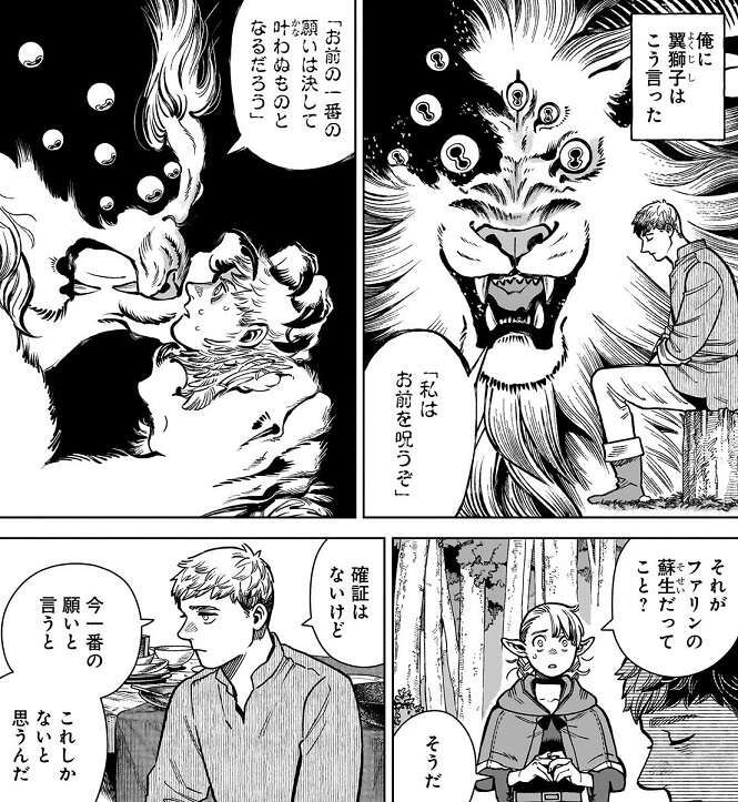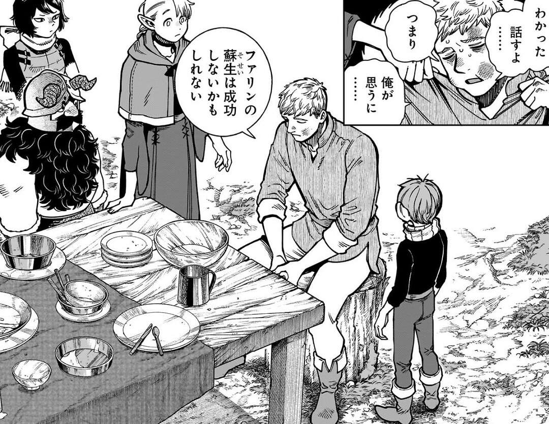 骨や皮や脂は小さく砕いて森や海に撒いているので、あとは植物や微生物が分解してくれるようです。足の復元のためにファリンの竜部分は、ファリンの体に少し残していますが、残った魂の量はファリンの方が圧倒的に勝っているので、人間の姿で生き返る可能性は高いです。しかしライオスは落ち込んでいて、その理由を話したがりません。チルチャックとマルシルが問い詰めると、ライオスは理由を白状しますが、その理由はファリンの蘇生は成功しないかもしれないと思っているからでした。