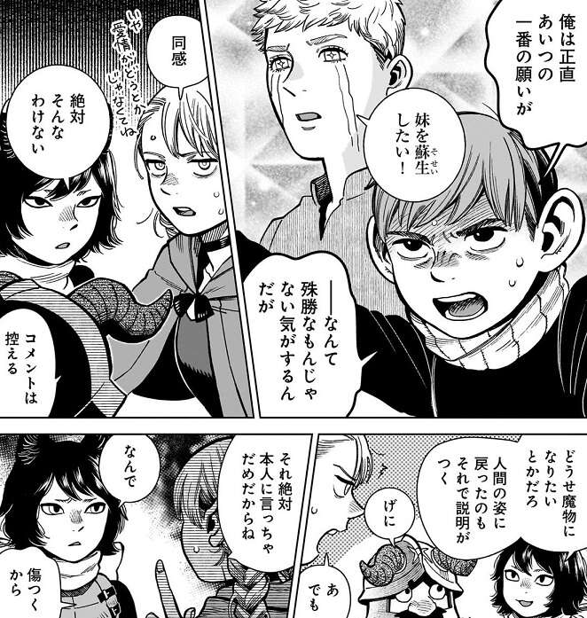 しかし、チルチャックもマルシルもイヅツミもセンシも、みんなライオスの一番の願いは妹の蘇生なんて、殊勝なもんじゃないと直感していました。みんな、ライオスの一番の願いは、どうせ魔物関連だろうと思っていましたが、マルシルは本人が傷つくから言わないように口止めします。