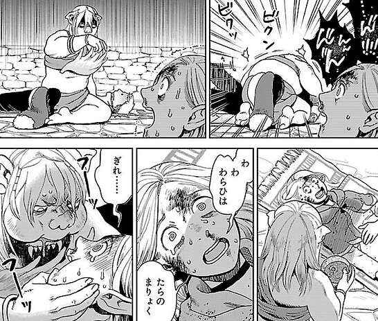 狂乱の魔術師に壁に閉じ込められ圧死させられそうになりましたが、幽霊たちに助けられオークの住む建物まで何とか移動できました。しかし、今度はオークの集団に拘束されそうになりますが、オークの集団の隊長が第3階層で知り合ったゾン族長の妹だった事もあり、なんとか見逃してもらえます。さらに炎竜を倒した礼として、体を動かせないライオスとマルシルにはオーク特製の調合薬を貰うことが出来ました(口移しで直接…)。