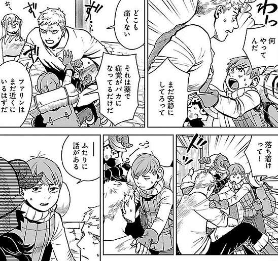 身体を動かせるようになったライオスは、いなくなったファリンをすぐに探しに行こうと無茶をしようとします。しかし、チルチャックはこれ以上の探索は無理で、必ず誰か死ぬ、ここは耐えて地上に戻ってくれ、とライオスを涙ながらに説得します。ライオスもチルチャックの必死の説得に考えを改め、一度地上に引き返すことを受け入れます。