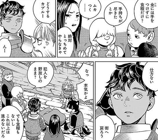 ライオスが一度地上に引き返す決心をする少し前、第4階層の地底湖で魚人に倒されて死んでいたカブルー一行は、タンスに蘇生してもらい全員無事生き返ることが出来ました。また何者かに食料を盗まれたと思い込んだリンシャとミックベルは、犯人を追いかけようとしますが、カブルーはタンスの一度街へ引き返すことだな、という助言もあり、力不足を認め街へ戻る決心をします。