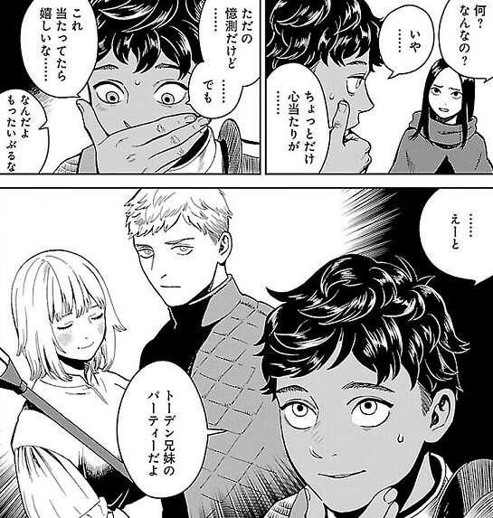 今後の為にもライオスに治療や防御魔法を使えるようになって欲しいと、マルシルは魔術をライオスに教えます。ファリンの兄だけあって素質があるのか、すぐにマルシルの耳の傷の治療に成功しますが、チルチャックはあまり嬉しそうではありません。リーダーであるライオスには人を繋ぎとめる能力、魔術よりも社交術や人を見る目を養って欲しいチルチャックとしては、マルシルと意見が対立します。