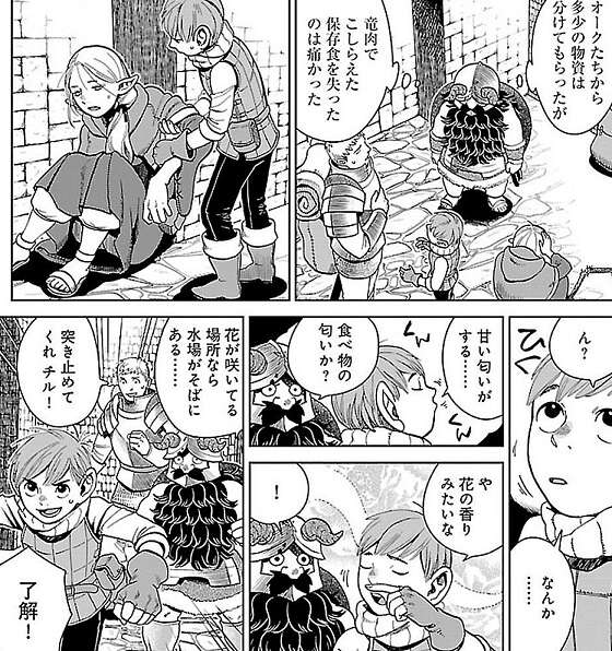 地上にいったん戻る決心をしたライオス達ですが、第5階層の城下町で道に迷ってしまい、ろくな食事も出来ず死にかけていました。狂乱の魔術師がライオス達を警戒しているせいか、迷宮が動いて形を変えているため行き止まりの壁がいたるところで、ライオス達の行く手を遮っています。そんな時、チルチャックは花のような香りに気付き、近くに水場があるかもしれないと近場を探索し始めます。