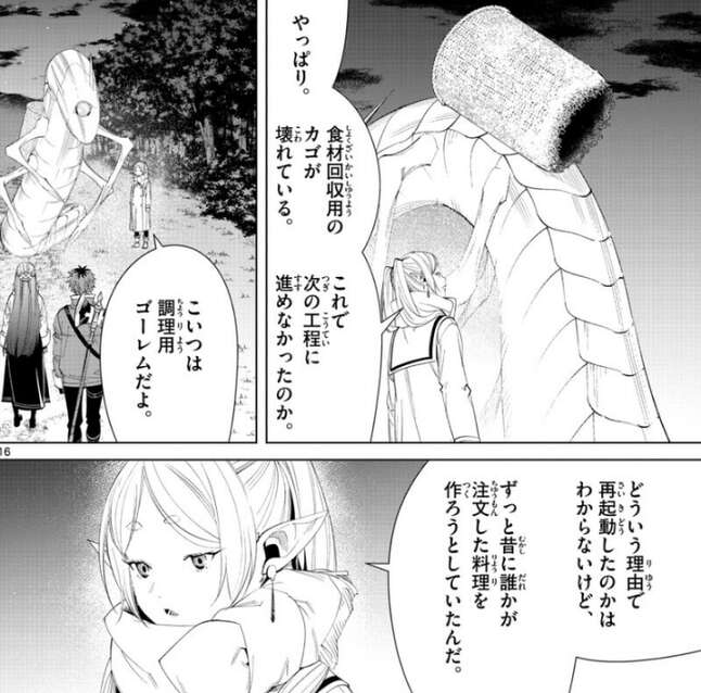 ゴーレムの様子を見ていたフリーレンは、なるほどそういうことか、とつぶやくと、ゴーレムに近づいていきます。シュタルクが危ないと叫びますが、ゴーレムに近づいたフリーレンにゴーレムは攻撃することなく、ゴチュウモンハ?と、ゴーレムが話しかけてきます。