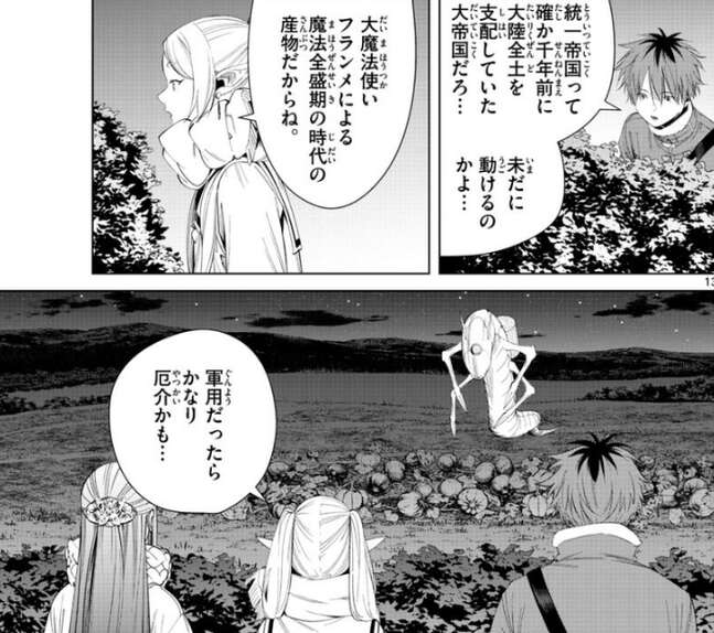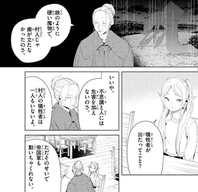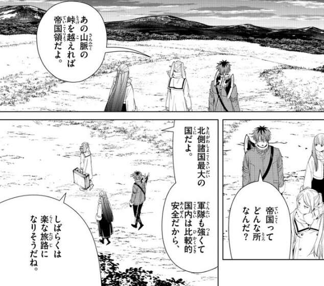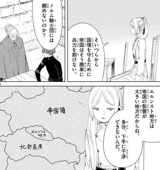 勇者ヒンメルの死から31年後、北部高原、エルンスト地方の農村にフリーレン達はたどり着きました。ここは北部高原と帝国領を繋ぐ要所で、次の山脈を超えればいよいよ帝国領です。帝国は北側諸国最大の国で、軍隊も強く国内は比較的安全なようで、魔物の危険も少なくこの辺りは楽な旅路になるようです。