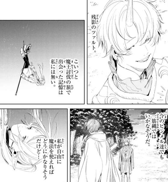 しかし、フリーレンは飛行魔法を使えるので、どうにかなりそうですが、飛行魔法を使うとヒンメル達への説明がややこしくなりそうで、下手をすると歴史が変わってしまう可能性があります。さらに、フリーレンは以前の魔王討伐の旅で残影のツォルトと出会った記憶はないようで、ヒンメル達でも残影のツォルトは一筋縄ではいかなそうです。空から自由落下しながら、フリーレンはどう対処しようかと冷静に悩みます。
