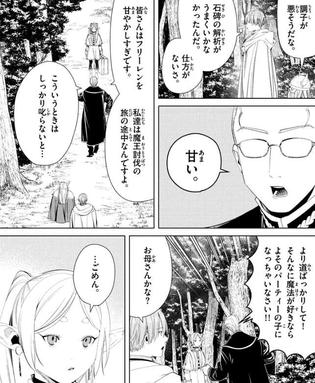 フリーレンが何かに悩んでいる事に気付いていたヒンメル達ですが、石碑の解析が上手くいかず調子悪い、とヒンメル達は思っているようです。ヒンメルは、仕方がないさ、とフリーレンの様子がおかしいことを怒ったりしませんが、ハイターは二人に甘い、と注意します。私達は魔王討伐の旅の途中なんだから、こういう時はしっかり叱らないと…、と言うと、フリーレンに対してお母さんのような起こりかたをします。フリーレンに対してお母さんのように接するのは、さすがフェルンの育ての親です。