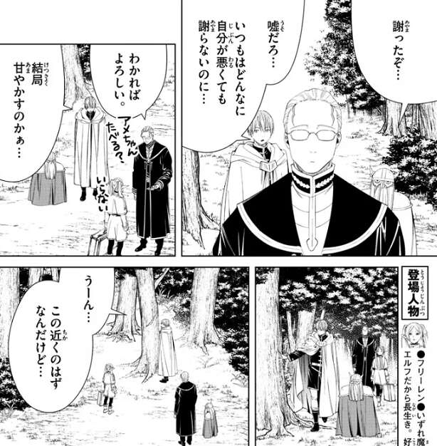 しかし、この頃のフリーレンはいつもどんなに自分が悪くても謝らない性格だったようですが、フリーレンが素直に謝った事に皆が驚きます。結局、ハイターはフリーレンを甘やかし、アメちゃんをフリーレンにあげようとします(拒否されますが…)。話は元に戻り、ヒンメルが木に付けた目印が見つからないようで、ヒンメルはフリーレンに探知魔法をお願いします。フリーレンは飛行魔法で空から探した方が早いので、見てこようか?と、ヒンメルに聞きますが、この時代はまだ人類は飛行魔法を使えないので、ヒンメル達は何を言っているんだ、という反応をします。結局、フリーレンは飛行魔法を使えないふりをして、ヒンメル一行は地上から街道を探します。