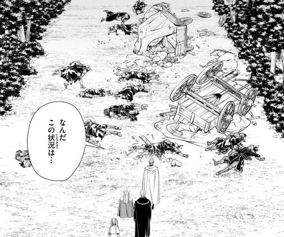 そしてようやく街道に出ますが、街道には帝国の軍隊がいましたが、軍人は皆死んでいて、馬車も壊れていました。まるで空から落とされたような、酷い有様に驚くヒンメル一行ですが、背後に突然、魔族が現れます。
