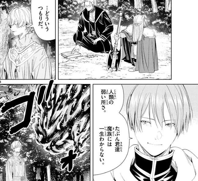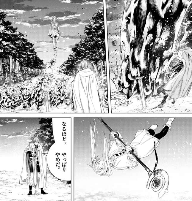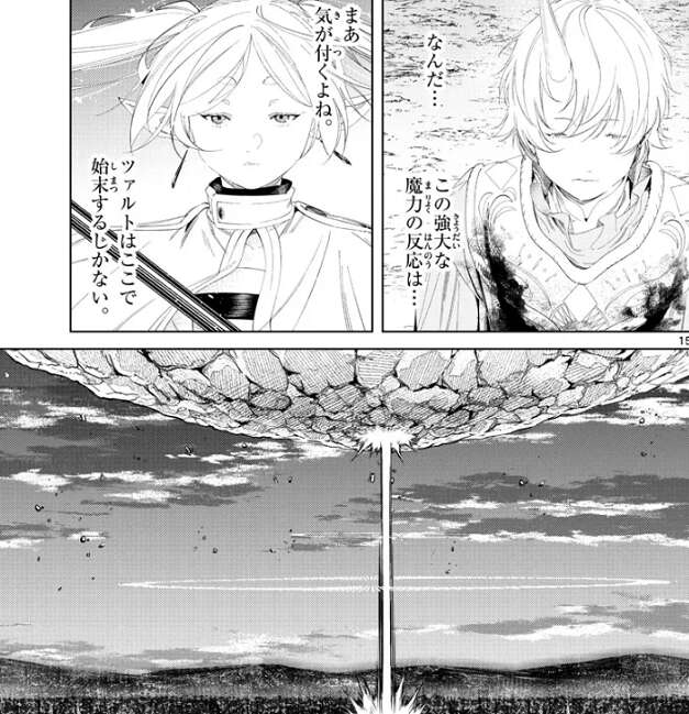 この時代の魔法は未来の魔法に比べて遅いようで、人を殺す魔法(ゾルトラーク)なら今ので勝負が決していた、とフリーレンは残念がります。一方、ツォルトはフリーレンが落下しながら正確な長距離射撃をしたことに、空中での訓練も無しにこんなことが可能なのか?と、驚きます。