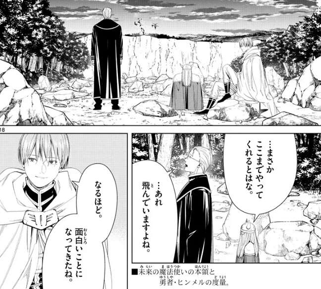 一方、フリーレンがここまでやるとは思っていなかったようで、アイゼンとハイターは飛行魔法で飛んでいるフリーレンを眺めて、呆然としています。ヒンメルだけは落ち着いていて、なるほど、面白いことになってきたね、とつぶやきます。