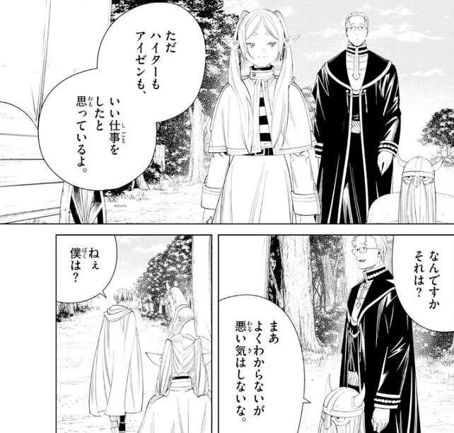 ただハイターもアイゼンも、いい仕事をしたと思っているよ、とフリーレンは二人に教えます。間違いなく、フェルンとシュタルクを弟子として育てた事だと思いますが、二人は何の事か分かっていませんが、悪い気はしていないようです。そして、ヒンメルにも励みになっているよ、とフリーレンは答えます。