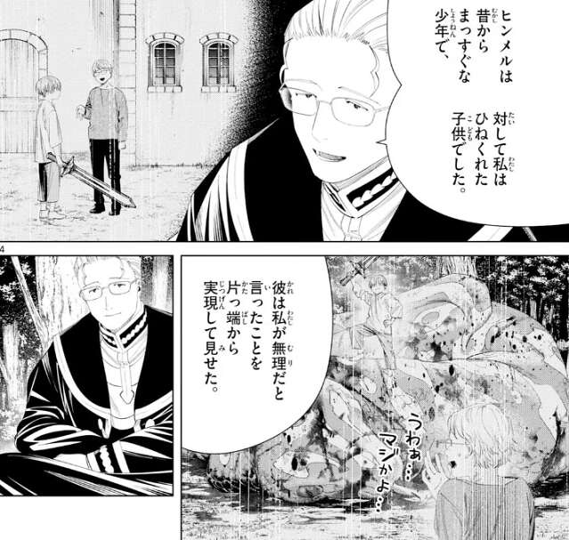ハイターとヒンメルは子供の頃から一緒で、ヒンメルはハイターが無理だと言った事を片っ端から実現して見せたようです。今週の扉絵で、ハイターとヒンメルが子供の頃に襲われた魔物も、子供の頃のヒンメルが一人で倒していてハイターがそれを見てドン引きしています。