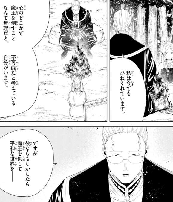 ハイターは、私は今でもひねくれていて、心のどこかで魔王を倒すことなんて無理だと、不可能だと考えている自分がいる、とフリーレンに言います。しかし、ヒンメルならもしかしたら、魔法を足して平和な世界を…、と言いかけてハイターは言うのを止めます。未来の関する出来事は聞くべきことではないとハイターは言い、話をやめます。