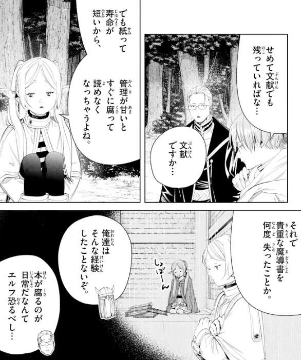 文献でも残っていれば女神の石碑を解読する手掛かりになるかもしれませんが、そういう情報も村ではなかったようです。フリーレンが、紙は寿命が短いから、管理が甘いとすぐに腐って読めなくなる、と愚痴っています。エルフの時間感覚では紙の寿命短いようで、フリーレンも貴重な魔導書を何度か失っているようです。しかし、アイゼンやハイターの時間感覚ではそんなことはなく、本が腐るのが日常だなんてエルフ恐るべし…、とハイターがつぶやいています。