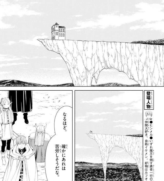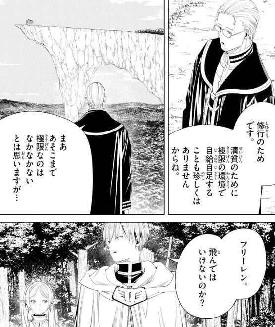 清貧のために極限の環境で自給自足することもあるそうですが、ハイターも断崖絶壁に建つ修道院を見て、まああそこまで極限なのはなかなかないとは思いますが…、とつぶやきます。ヒンメルがフリーレンに、魔法で飛んではいけないのか?と、聞きますが、この時代はまだ飛行魔法を人類は使えないので、人に見られるわけにはいけないと飛ぶことも出来ません。