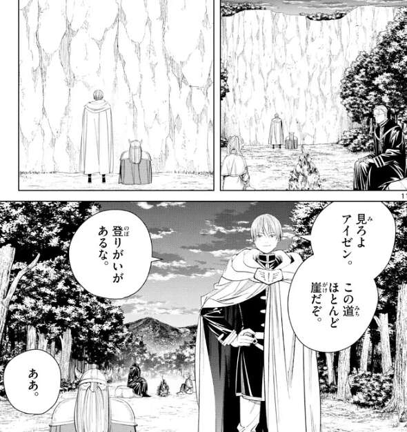 フリーレンの飛行魔法も使えないと分かり、ヒンメルは断崖絶壁を登る決断をします。断崖絶壁のそばまで行くだけでも一苦労ですが、先の道はほとんど崖です。ハイターとフリーレンは疲れて休んでいますが、ヒンメルは登りがいがあるな、と言いヒンメルとアイゼンはやる気満々です。