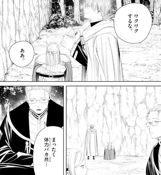 どちらにしろヒンメルに付いて行くつもりです、とハイターは言い、私は自分を信じることはできませんが、勇者ヒンメルのことは信じています、とハイターは断言します。その後、修道院には何とかたどり着きますが、写本を見ても女神の石碑を解読する手掛かりは何も見つかりませんでした。さすがに疲れ果ててしまっていますが、ヒンメルはすぐに、よし次だ!と、前向きです。フリーレンはヒンメルに、流石に前向き過ぎない?と、ツッコみ、ハイターは愉快そうに笑います。