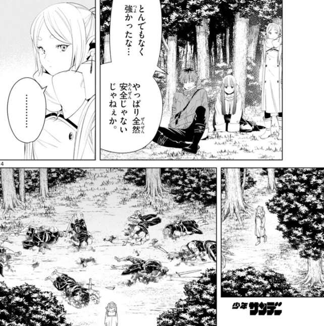 何とか魔物の群れを討伐しますが、魔物たちはとんでもなく強かったようで、フェルンやシュタルクは座り込んでいます。何かが気になったフリーレンは森の方に向かうと帝国の小隊を見つけますが、兵士達は全員死んでいました。