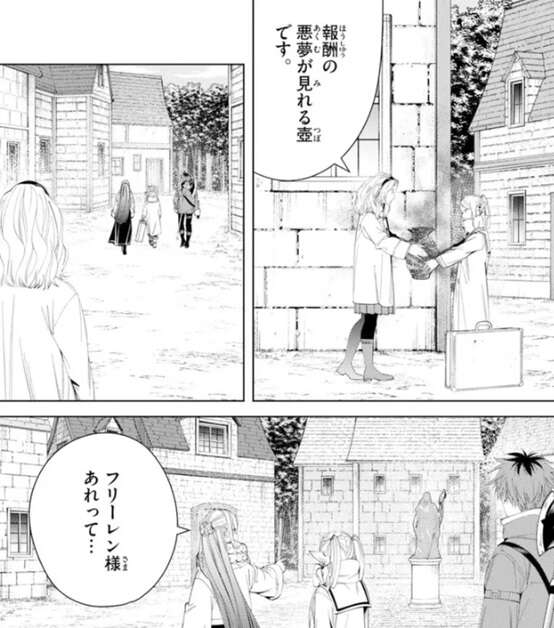 帝国の小隊に討伐を依頼したようですが音沙汰もなく困っている様子ですが、村にはあまり蓄えもなく、また魔導書もなく報酬は難しい様子です。魔道具は無いかとフリーレンは聞くと、魔道具かは分からないが不思議な力を持った品ならあると村人は答えます。そして、村人は悪夢を見れる壺を持ってきます。
