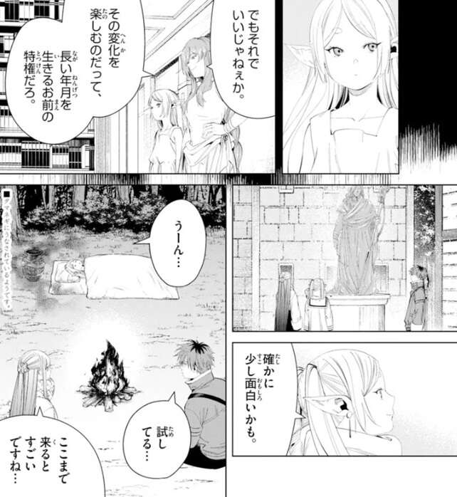 しかし、その変化を楽しむのだって、長い年月生きるお前の特権だろ、とフランメは言い、フリーレンに変化を楽しむように言います。フランメの言葉を思い出したフリーレンは、おっさんのフランメ像を改めて見て、確かに少し面白いかも、と言いながら変化を楽しみます。その後、フリーレンは悪夢が見れる壺を実際に自分で試し、悪夢にうなされます。フェルンもシュタルクも、フリーレンの魔法に対するこだわりにあきれるのを通り越して感心しています。