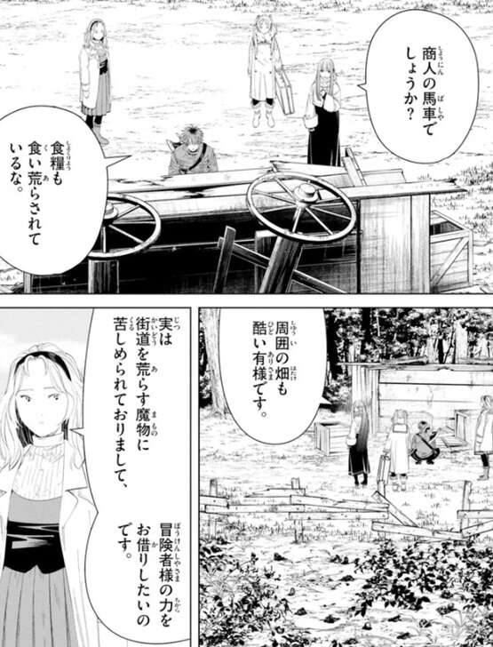 勇者ヒンメルの死から31年後、帝国領ファルベ地方に到着したフリーレン一行は、村人に案内されて馬車が襲撃された場所に向かっています。商人の馬車は襲われていて食料も食い荒らされています。街道を荒らす魔物がこの辺りに出没するようで、周囲の畑も荒らされていて、村人はフリーレン達に魔物討伐の依頼をします。
