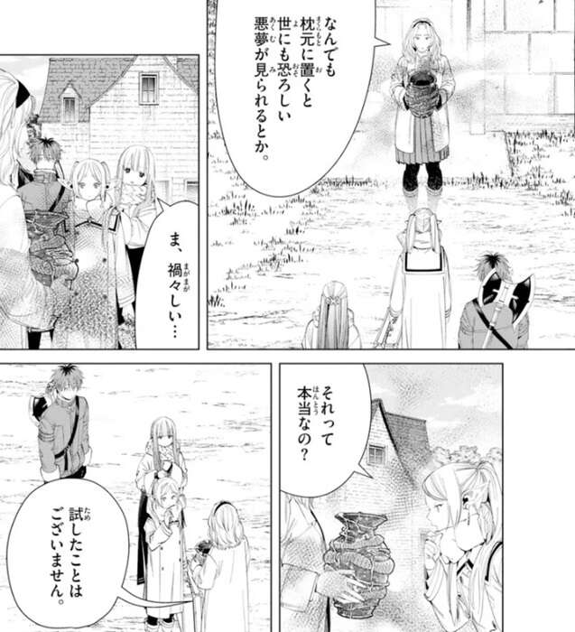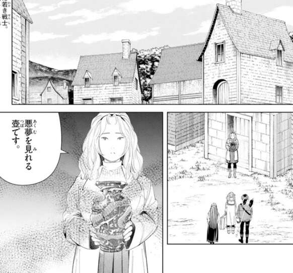 この壺を枕元に置くと世にも恐ろしい悪夢が見られるらしいですが、禍々し過ぎてフェルンが引いています。しかし、フリーレンは興味津々で村人に壺の事を質問しています。