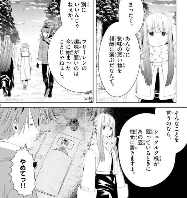 魔物の討伐依頼を引き受けたフリーレン達は、街道を見て回りますが、フェルンはあんなに気味の悪い壺を報酬に選んだフリーレンに文句を言っています。しかしシュタルクは、フリーレンの趣味が悪いのは今に始まったことじゃねぇし、と言い壺の事は気にしていません。しかしフェルンは、そんなことを言うのなら、シュタルク様が眠っているときにあの壺を枕元に置きますよ、と言うとシュタルクは泣きながらやめてとフェルンに許しを請います。街道を歩いていくと壊された小屋も見つかり、シュタルクがフリーレンに帝国領内は安全じゃないのか?と、聞きます。フリーレンもこの村に来るまでの間の寂れた感じが気になっているようで、そのはずなんだけどね、と答えながら前来た時との違いに戸惑います。