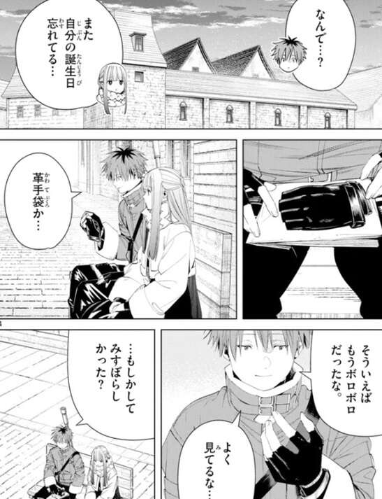 また自分の誕生日の事を忘れていたシュタルクは、何のプレゼントか分からず、また自分の誕生日忘れてる…、とフェルンにツッコまれます。フェルンの誕生日プレゼントは革手袋でしたが、今着けているシュタルクの革手袋はもうボロボロだったようで、…もしかしてみすぼらしかった?と、シュタルクはフェルンに聞きます。