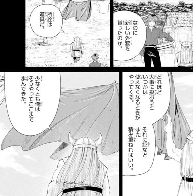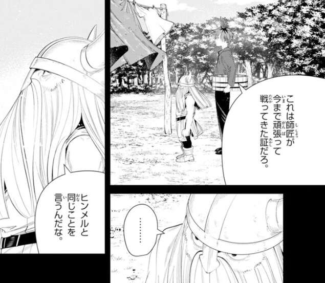 アイゼンのマントは年季が入っているとシュタルクが言うと、こんな古くて汚いマント、いつまでも持っているのは不思議だろう、とアイゼンは言います。しかし、そうは思わねぇよ、これは師匠が今まで頑張って戦ってきた証だろ、とアイゼンに言います。すると、ヒンメルと同じことを言うんだな、とアイゼンはシュタルクに答えます。