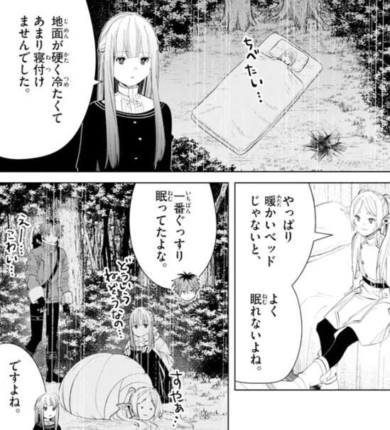 勇者ヒンメルの死から31年後、帝国領ヘーレン地方の街に到着したフリーレン一行は、久々の街でようやくのんびりできると嬉しそうです。これまでは野営ばかりで、地面が固く冷たくてあまり寝付けなかったとフェルンが言い、暖かいベッドでないとよく眠れないとフリーレンも言います。しかしフリーレンは野営でも一番ぐっすり眠っていて、フェルンとシュタルクは野営でのフリーレンの寝相にもあきれていたそうです。