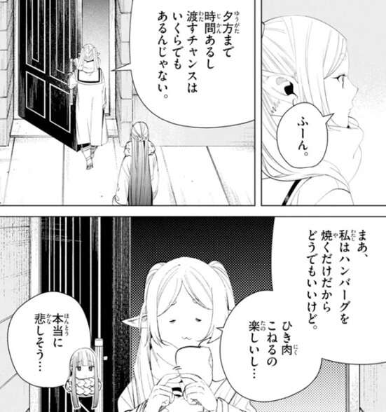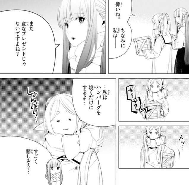 宿を取ったフリーレン一行は、夕方まで自由行動にします。フリーレンは宿でのんびりすると言い、シュタルクは鍛冶屋で斧を研いでもらうと言って歩いて行きました。シュタルクがいなくなり、フリーレンはフェルンに、今日はシュタルクの誕生日だよ、と言うと、今回はフェルンもちゃんとプレゼントを用意していました。偉いね、ちなみに私は、とフリーレンが言いかけて、自分のプレゼントを見せようとしますが、また変なプレゼントじゃないですよね?と、フリーレンはフェルンに釘を刺されます。フリーレンは以前、シュタルクに服だけ溶かす薬を渡そうとしていたので、変な物を渡さないかフェルンは確認しますが、フリーレンはガタガタする箱を脇にスッと抱え直すと、私はハンバーグを焼くだけにするよ…、としょんぼり言います。何を渡そうとしていたのか気になりますが、しょんぼりしたフリーレンを見てフェルンは、すごく悲しそう…、とつぶやきます。