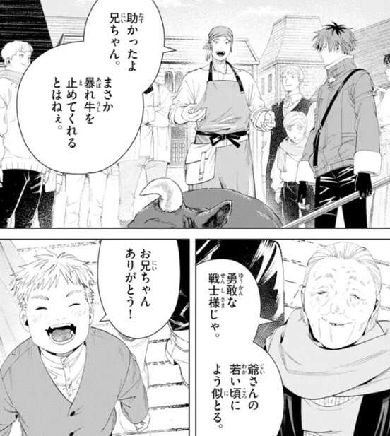 プレゼントを渡すなら早い方がいいんじゃない、とフリーレンは言いますが、なかなかタイミングがつかめなくて…、とフェルンが答えると、夕方まで時間あるし渡すチャンスはいくらでもあるんじゃない、とフリーレンはフェルンにアドバイスします。シュタルクにハンバーグを作ってあげるだけのフリーレンは、まあ、私はハンバーグを焼くだけだからどうでもいいけど、ひき肉こねるの楽しいし…、とつぶやき、その様子を見たフェルンに、本当に悲しそう…、と同情されます。鍛冶屋はすぐそこの広場にあるとフリーレンから聞き、シュタルクを追いかける事にしたフェルンですが、シュタルクは短い時間の間に暴れ牛に遭遇していて、暴れ牛を止めていました。暴れ牛を止めたシュタルクの周りには人だかりができていました。