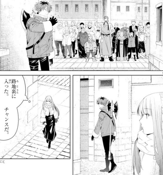 こんなに人がいたら渡せないと、一人になるのを待つフェルンは、街の人達と別れ路地裏に入っていったシュタルクを見て、チャンスだとシュタルクに近寄ろうとします。