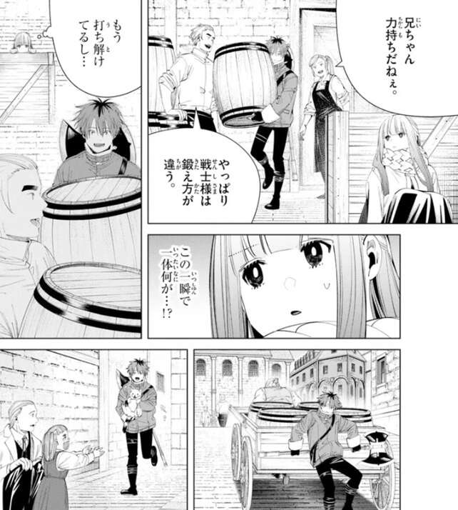 しかし、路地裏でシュタルクは樽を運ぶ手助けを既にしていて、シュタルクは街の人とすっかり打ち解けています。この一瞬で一体何が…!?と、シュタルクの人当たりの良さに驚くフェルンですが、その後も街の人を手助けしては打ち解けるので、フェルンはシュタルクに誕生日プレゼントを渡す事が出来ません。さらにこの街でも、達人みたいな人にシュタルクは稽古を付けられていて、変な人にも好かれています。