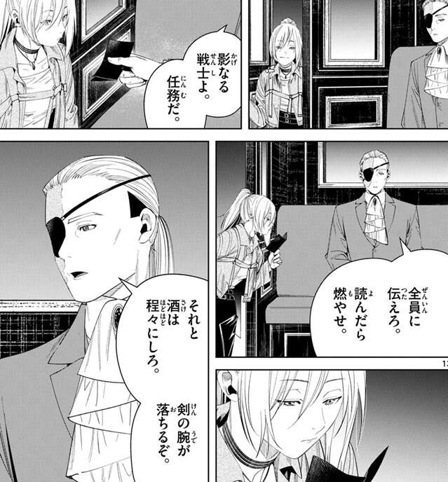 そして閣下と呼ばれていた男ですが、帝国最北端ロルベーア領総督、“レーヴェ”という身分と名前があるようです。閣下と呼ばれていたのでかなり高い地位の人間だと思っていましたが、総督という事はかなりの地位なので帝国の大勢の兵士に命令を出せそうです。今回で影なる戦士が他にも8人、任務を受けて動き出しましたし、フリーレンやゼンゼ達の敵はかなりの人数・規模になりそうです。ただ、魔導特務隊と影なる戦士達が連携している様子は今の所なさそうですが、お互い連絡を取っていたりするのでしょうか?その辺りも気になります。