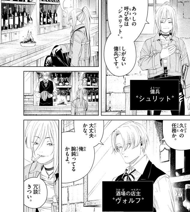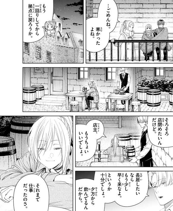 …ごめんね、寒かったよね、とフリーレンが振り返りますが、ちゃっかりフェルンとシュタルクは二人でブランケットに入って暖まっていました。その後、フリーレン一行はもう一回りしたら、拠点に戻る事にします。一方、別の酒場では傭兵の女が酒を飲んでいて、マスターにそろそろ店閉めたいんだけど、と言われています。傭兵の女は夕方から飲んでいて、それまでは仕事だったそうです。マスターは傭兵の女に飲み過ぎなんじゃないと言い、それを飲み終わったら帰るように言います。
