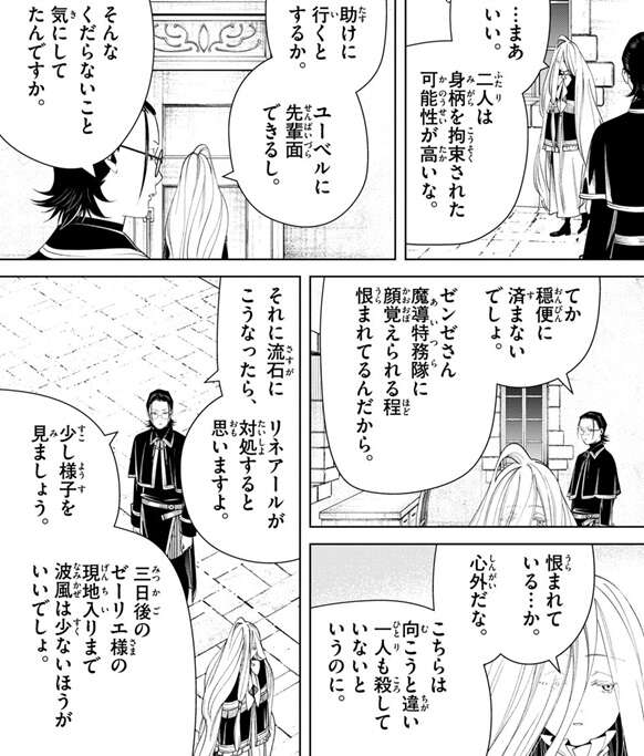 魔導特務隊は帝都にいないというリネアールの報告があったからこそ、ラントとユーベルへの情報の受け渡しはあのような形にしたそうです。ゼンゼはラントとユーベルを助けに行こうとしますが、その理由がユーベルに先輩面が出来るから、でファルシュが、そんなくだらないこと気にしてたんですか、とあきれています。しかし、ゼンゼは魔導特務隊に顔を覚えられる程恨まれているから、穏便に済まないとファルシュに言われてしまいます。ゼンゼは、恨まれている…か、心外だな、こちらは向こうと違い一人も殺していないというのに、と言い不服そうにしますが、ファルシュにリネアールが対処すると思うから少し様子を見ましょうと言われます。ゼーリエの現地入りは三日後のようで、それまでは波風は少ない方がいいとファルシュはゼンゼに自重を求めます。