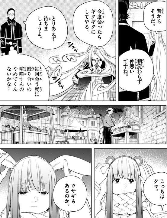 ゼンゼとリネアールは仲が悪いようで、リネアールの事を面倒事が大嫌いで、いざという時は保身のために動く、昔からそうだ、とゼンゼは言い、今度会ったらギタギタにしてやる、と髪の毛も使って殴るポーズをとります。ゼンゼとリネアールは毎回会う度に殴り合いの喧嘩をしているようで、ファルシュはやめてくんないかな…と心の中でつぶやいています。一方、フリーレン一行は帝都の街中を見回り中ですが、フリーレンはまだ魔道具を見ています。第127話では猫耳のような魔道具をフェルンにつけていましたが、今度はクマやウサギの耳のような魔道具をフェルンに着けて遊んでいて、フェルンが嫌そうな顔をしています。