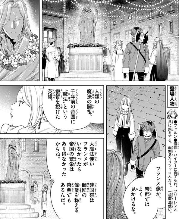 しかし、向こうもすぐに仕掛けてくるつもりはないとフリーレンは考えているようで、慎重に探っていくしかないとフリーレンは言うと、帝都の広場にあるフランメ像を見ます。このフランメ像は実際のフランメとは違いおっさんですが、それでもこの建国際は大魔法使いフランメの偉業を称える祭典でもあるそうです。13巻 第121話でフランメが弟子の複数の宮廷魔法使いを育てている場面があったので、フランメは帝国の歴史にかなり関わっているのでしょう。