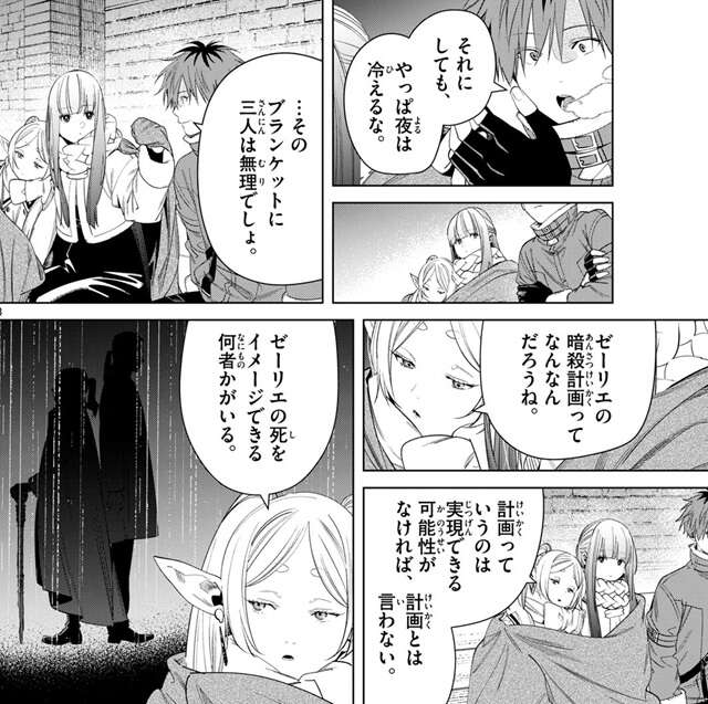 人類の誰もが魔法を使える時代、この国は師匠フランメの夢に一番近い場所にある、と魔法で出来た打ち上げ花火を見ながらフリーレンはつぶやきます。その後、シュタルクがやっぱ夜は冷えるなと言うと、フェルンが自分とフリーレンが使っているブランケットにシュタルクも入れようとしますが、三人は無理でしょうとシュタルクは断ります。そしてフリーレンはゼーリエの暗殺計画について話しますが、計画っていうのは実現できる可能性がなければ、計画とは言わないと言い、ゼーリエの死をイメージできる何者かがいる、そいつらはどれほどの力を持っていて、どれだけの力を動かせるんだろうね、とフリーレンは想像します。もしかしたらゼーリエの敵に回るのは、帝国という魔法文明そのものかもしれない、とフリーレンはつぶやきます。