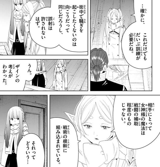 ザインが先ほど指さした僧侶の位置は適当でないとフリーレンはザインに確認すると、フェルンに相手の弱点は女神様の魔法に頼り切っている事だと言います。司令塔を叩けば相手のパーティは動けなくなる、とフェルンが言うと、フリーレンは街中での攻撃の許可をフェルンに出します。