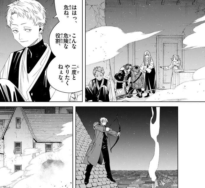 ヴォルフの弓矢はシュタルクが防ぎ、フリーレン達は机を盾に弓矢を防ぎます。一方、ヴォルフはガゼレに上出来だと言い、これで奴等を炙り出せる、とフリーレン達を弓で狙います。