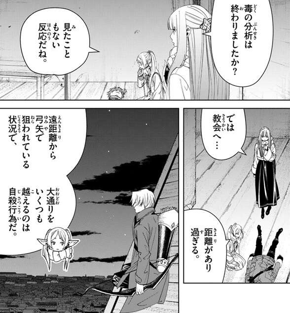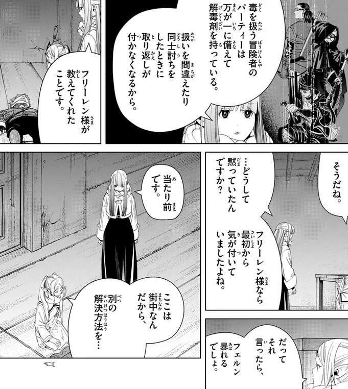 一方、フリーレンは毒に侵されたシュタルクを魔法で治癒していましたが、見たこともない毒のようで苦戦していました。フェルンはシュタルクを早く教会へ運びたいようですが、フリーレンは敵が女神様の魔法を使っていた事を気にしています。教会の関係者として紛れ込んでいる可能性をフリーレンは指摘し、教会に連れて行くのは結局止めることになります。