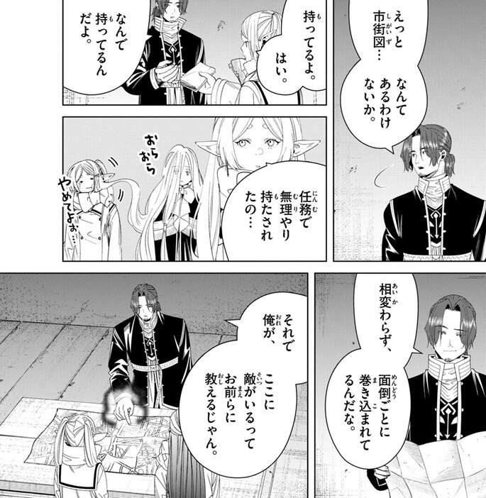シスター・ロレはガゼレに廃屋に向かいように言います。一方、フリーレンはザインに、敵に逆探知されて追い詰められている状況を説明します。フリーレンはゼンゼに持たされた市街図をザインに渡すと、ザインは逆探知の脆弱性を突いて敵の僧侶の位置が分かったとして、なんの躊躇もなくその場所を撃てるかと質問します。フリーレンは誤射は許されないと考え、敵の位置が分かったとしても撃つだけでだいぶ訓練が必要だと言います。