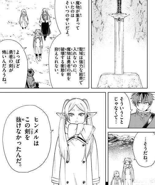 魔物が集まっていたのは勇者の剣のせいで、聖域は強力な結界で入れませんが、魔物は勇者の剣を破壊する衝動が抑えられないそうです。そういうことじゃなくて…、とシュタルクが言うと、ヒンメルはこの剣を抜けなかったんだ、とフリーレンが言うと真相を語り始めます。