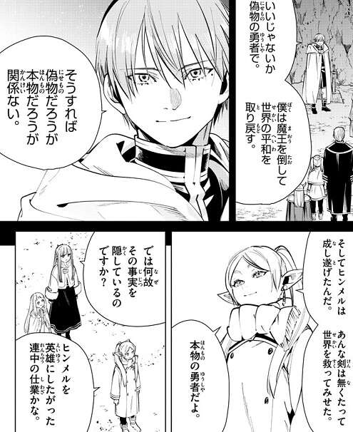 ヒンメルが勇者の剣を抜けず落ち込んでいるような様子でいると、ハイターが心配そうに声をかけます。するとヒンメルは笑みを浮かべ、いいじゃないか偽物の勇者で、僕は魔王を倒して世界の平和を取り戻す、とフリーレン達にヒンメルは言います。そしてヒンメルは勇者の剣なんか無くたって世界を救ってみせた、とフリーレンは語ります。では何故その事実が隠されているのですか?と、フェルンが聞くと、ヒンメルを英雄にしたがった連中の仕業かな、英雄が勇者の剣を抜けなかっただなんてかっこ悪いエピソードは不要でしょ、とフリーレンは言います。