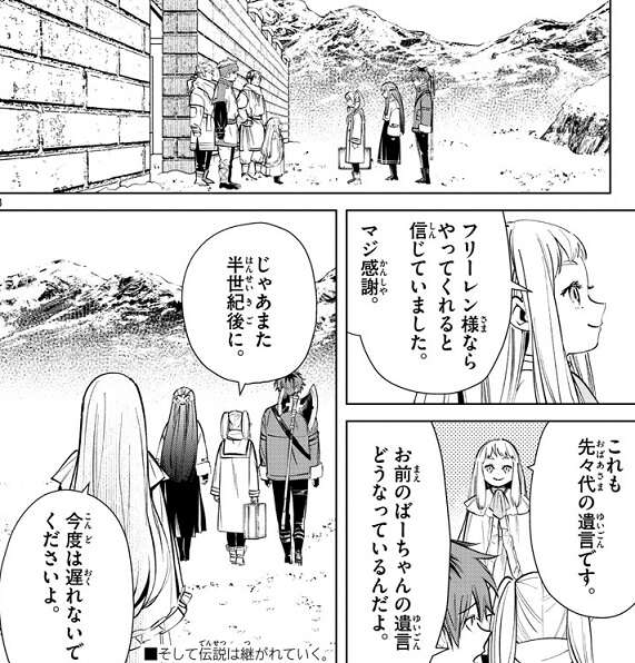 フリーレン様ならやってくれると信じていました、マジ感謝、これも先々代の遺言です、と里長が言うと、お前のばーちゃんの遺言どうなっているんだよ、とシュタルクがツッコみを入れます。じゃあまた半世紀後に、と言うとフリーレン達は剣の里を後にします。